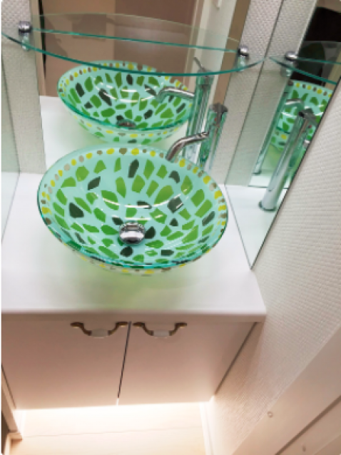 【洗面所】:デザインガラスボールによるオリジナル洗面化粧台。