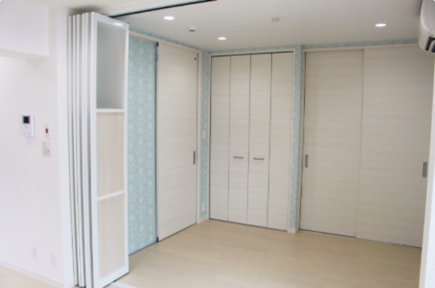 【間取り(2)】:折戸+引戸パネルを締めるとリビングと居室に分かれ、暮らしに合う間取りにカスタマイズできます。