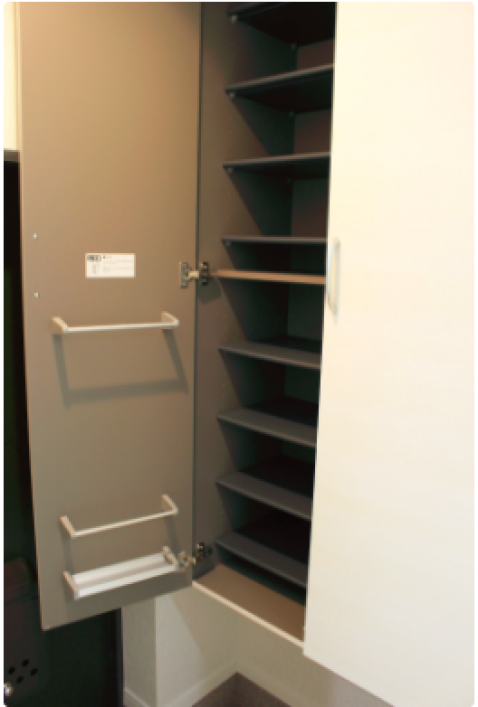 【玄関】:コンパクトながらたっぷり収納のシューズボックスを設置。