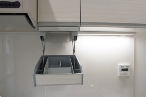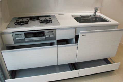 【キッチン】:3口ガスコンロでお料理に便利!システム収納ラック付きでよく使う調味料もスッキリ収納☆